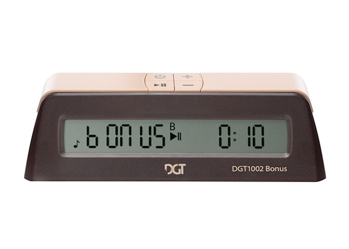 The Chess Starter Box Brown includes a double folded chess board, high quality weighted DGT Plastic Chess Pieces with King height 86mm and the DGT1002 Bonus Timer.