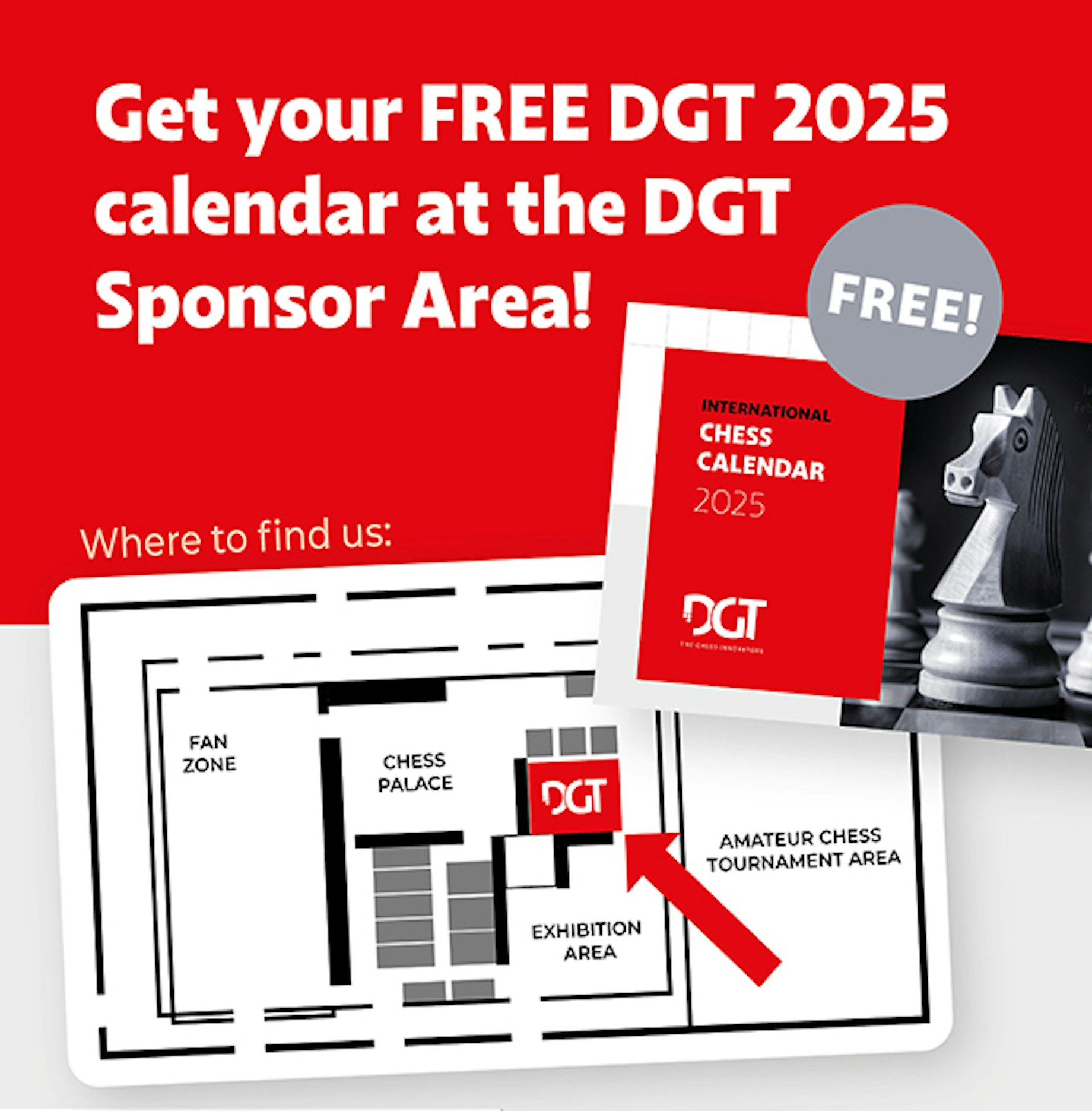 For visitors attending the event, the DGT booth in the Expo Area is a highlight. Here, chess enthusiasts and federation representatives can explore a wide range of DGT’s innovative chess products. To celebrate this occasion, DGT is offering a free calendar to everyone who visits their booth, making it an attractive spot for all attendees.