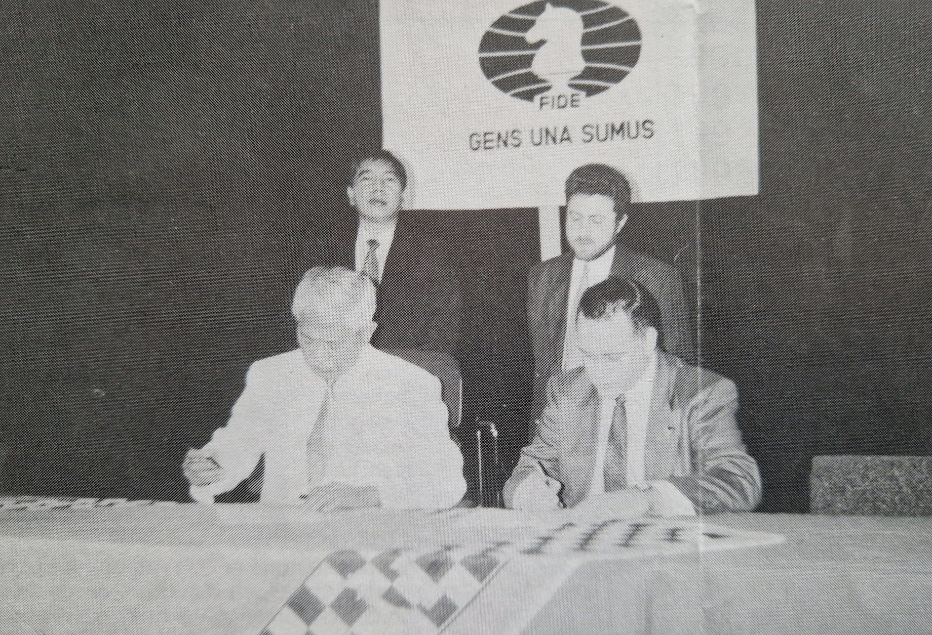 FIDE President Florencio Campomanes (left) and DGT Director Albert Vasse sign the first agreement in 1993 in attendance of FIDE Secretary Casto Abundo (left) and Vice President GM Bachar Kouatly.