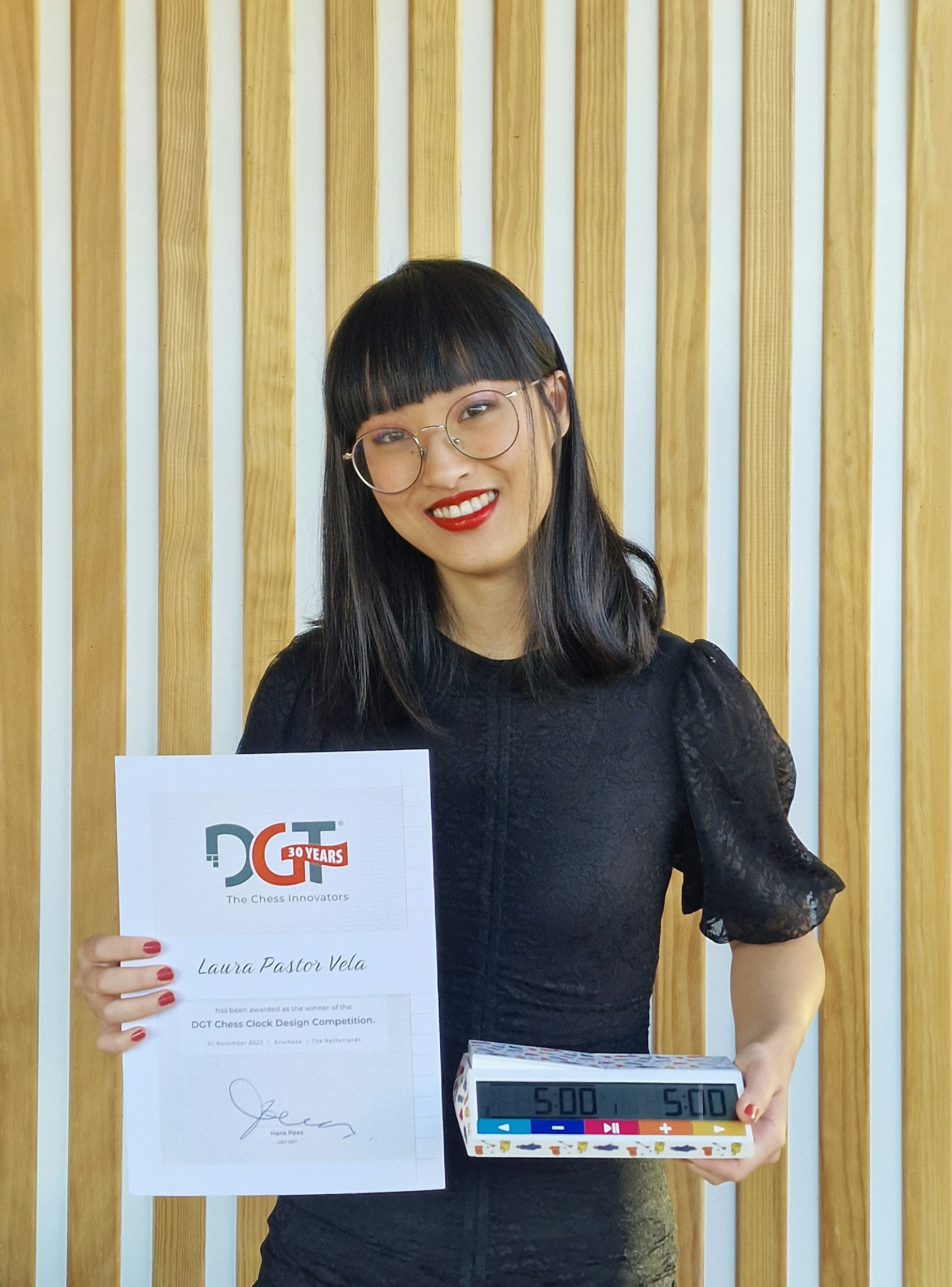 DGT produced a few copies of the winning chess clock and one of them was presented to Laura. This new design is particularly special as it commemorates DGT's 30 years in the chess industry. This clock is not just a timekeeper; it is a celebration of three decades of precision, innovation, fun and playfulness that characterizes the timeless spirit of the game of chess.