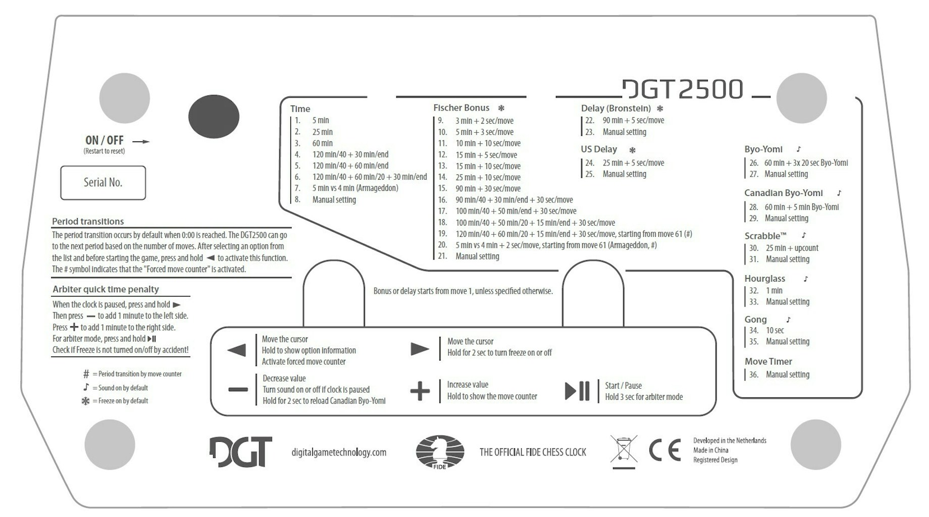You will find the options of the DGT2500 on the bottom of the chess clock.
